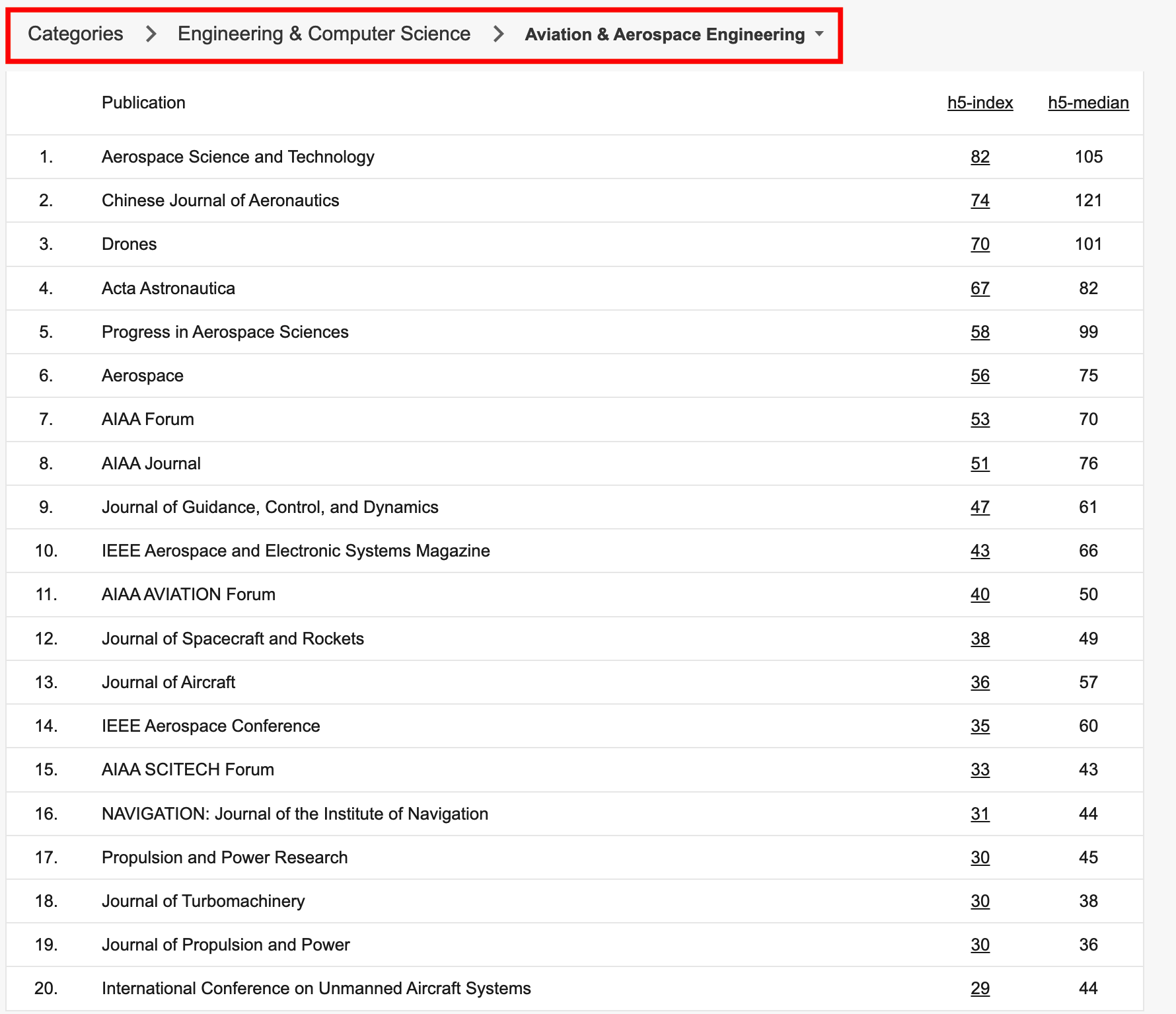 My field, aerospace/spacecraft engineering, is a much smaller niche so doesn’t appear on this list; for most researchers, I suspect this is true so I suggest clicking on the “Categories” button in the left of list of publications and navigate to your specific discipline. In my case, this is what the list looks like.