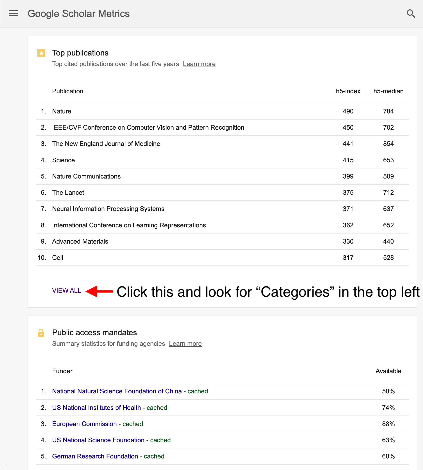 Click the hamburger and find the Metrics option. This reveals a list of top publications, where you should click on “View All”.