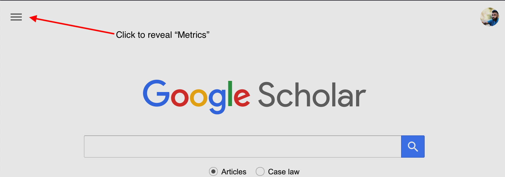 Approach 2: Another way to identify a publication venue is by using the Google Scholar’s “Metrics” feature; click on the hamburger on the top left corner to locate that.