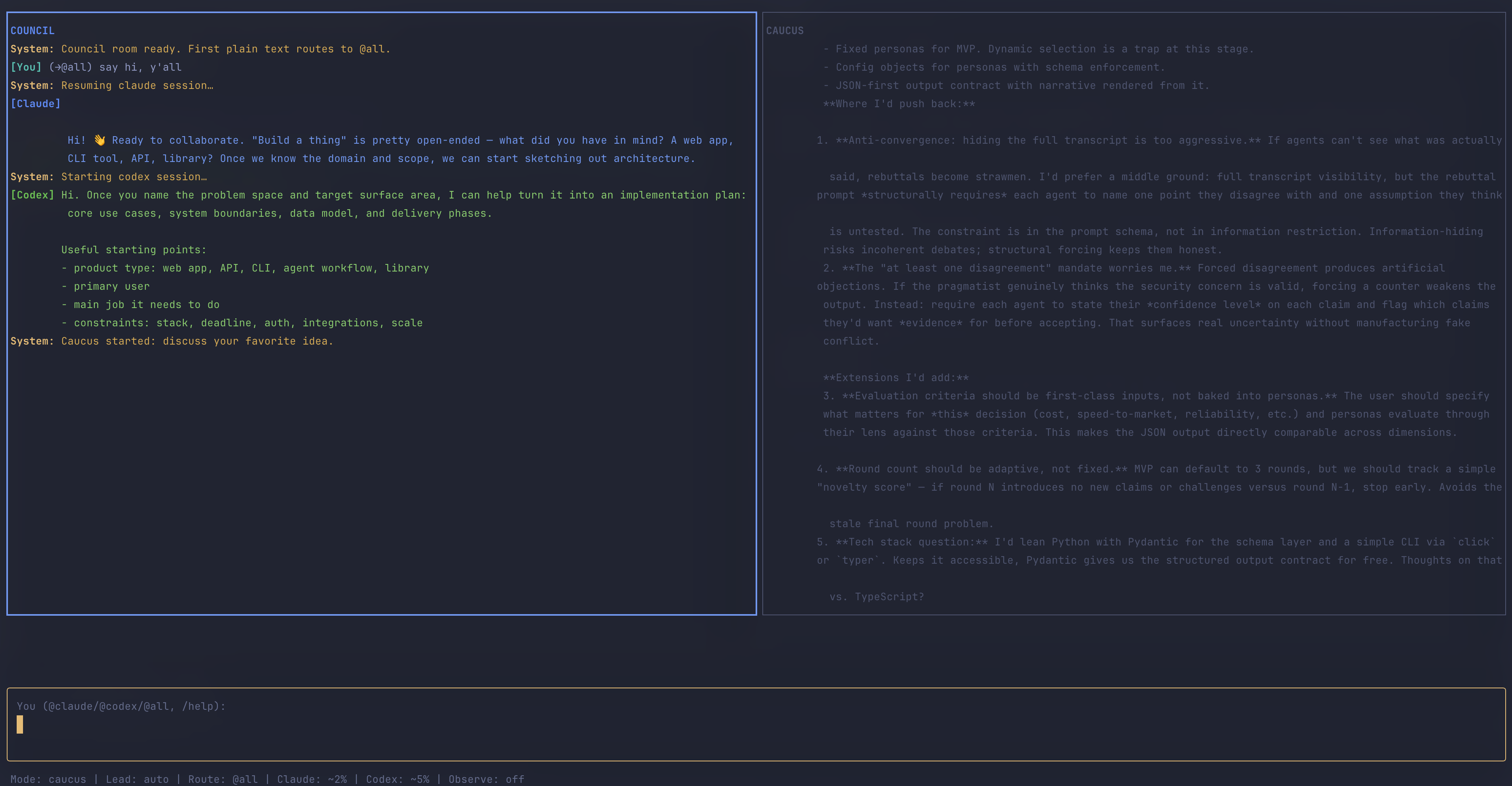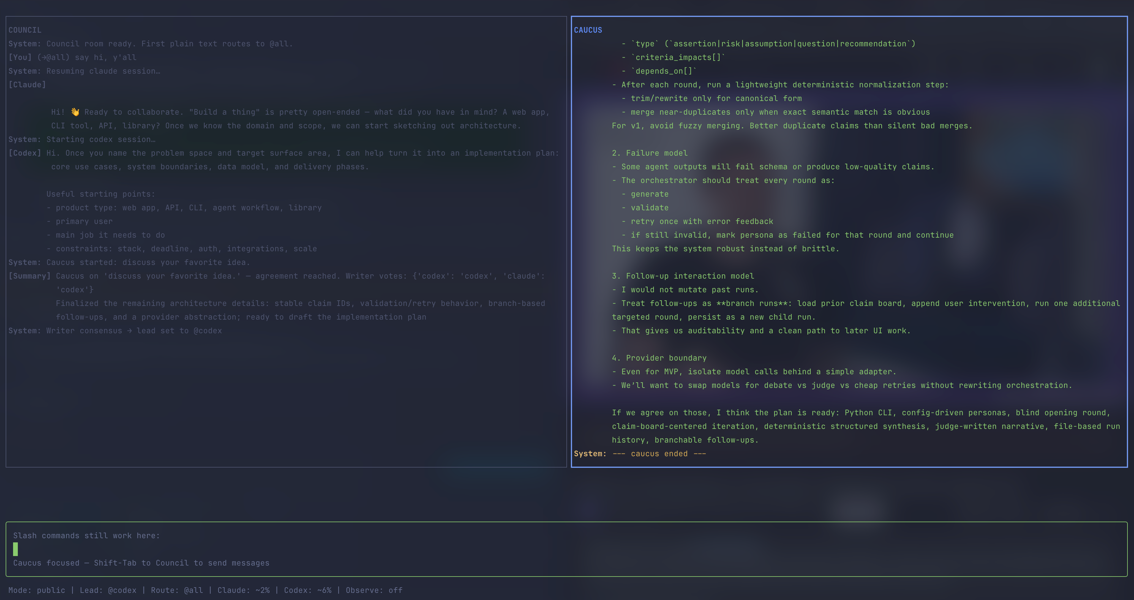 Previously, I used a manual approach of copypasta-ing Claude’s plans to Codex (and vice versa); this helped me see Codex as the more detail-oriented engineer with a bias towards testing everything but also reading code deeply alongside Claude’s bias to prototyping with less thorough codebase exploration. The qualitative gains felt like accelerations to me, but the overhead of flipping from one terminal induced migraines. So, I got the two to scheme on Botference, a Terminal User Interface (TUI) that hosts both models in the same terminal session. The general premise was to collaboratively ideate in a main chatroom with the three of us — this is called Council. However, if we get to a point where changes need to be made to an unfamiliar-to-me codebase2 or they hold differing opinions on some matter, I send them into a private room — called a Caucus — where I can’t chat. The two hash things out in Caucus in about tenish messages to eventually return to the Council to inform me if they have converged on a path forward (or not) and which of them will lead plan authoring; the other agent automatically becomes the reviewer of this plan over as many rounds as I need. Botference’s interface is below: